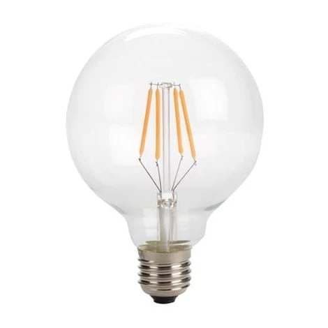 données électriques: •• LED: filament LED •• puissance nominale: < 4 W •• tension nominale (driver): 220-240 VCA, 50/60Hz •• facteur de puissance: > 0.4 •• consommation kWh/1000 h: 4 •• adaptée à des variateurs: non • données techniques: •• couleur: blanc chaud intense •• température de couleur: 2200 K •• SDCM: – •• angle de rayonnement: 360° •• intensité lumineuse: cd •• flux lumineux: 400 lm •• indice de rendu de couleur: > 80 •• temps de démarrage: < 0.5 s •• temps de chauffe (60 %): < 1 s • durée de vie: •• durée de vie nominale: 15.000 h •• nombre de cycles d’allumage: 15.000 • dimensions et poids: •• type: G95 •• culot: E27 •• dimensions: Ø 95 x 136 mm •• poids: 54 g
