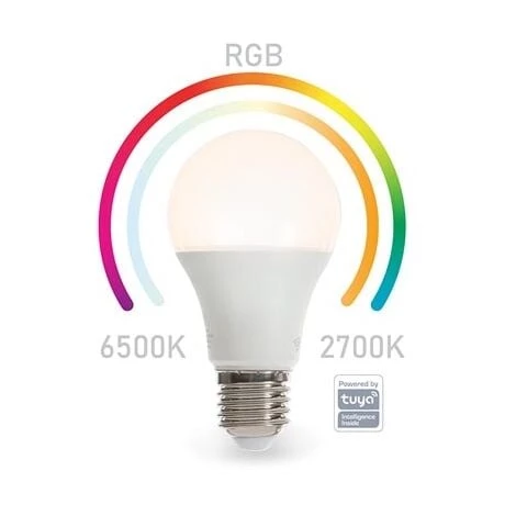 données électriques: •• LED: 40 x LED SMD •• puissance nominale: 8.5 W •• facteur de puissance: > 0.5 •• consommation kWh/1000 h: 8.5 •• intensité réglable: non, via application seulement •• alimentation: 220-240 V~ 50/60 Hz •• consommation de courant: 0.065 A •• consommation en veille: < 0.5 W • données techniques: •• couleur: blanc froid / blanc chaud / RGB •• température de couleur: 2700 – 6500 K •• SDCM: – •• angle de rayonnement: 180° •• intensité lumineuse: cd •• flux lumineux: 806 lm •• indice de rendu de couleur: > 80 •• temps de démarrage: < 0.5 s •• temps de chauffe (60 %): < 1 s • durée de vie: •• durée de vie nominale: 15.000 h •• nombre de cycles d’allumage: 15.000 • dimensions et poids: •• type: A60 •• culot: E27 •• dimensions: Ø 60 x 109 mm •• poids: – g • connexion sans fil: •• plage de fréquence: 2412-2484 MHz •• puissance RF: 16 dBm