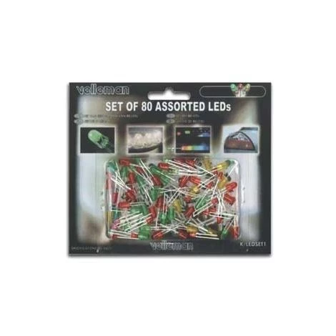quantité: 80 pcs • contenu: •• 15 x: 3mm vert, 4.0mcd •• 20 x: 3mm rouge, 1.0mcd •• 15 x: 5mm vert, 6.0mcd •• 20 x: 5mm rouge, 2.0mcd •• 10 x: 5mm jaune, 3.9mcd
