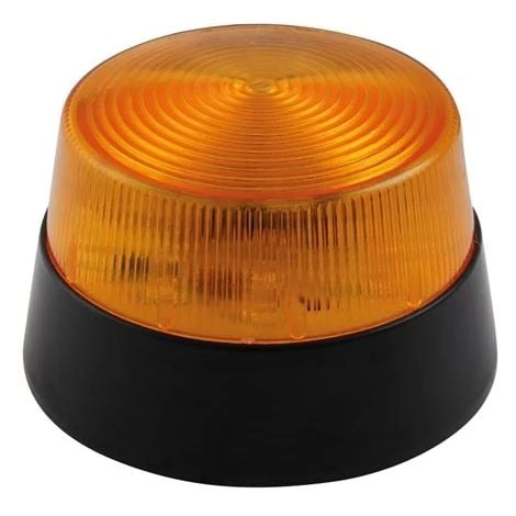 dimensions: ø 77 mm x 45.7 mm • LEDs: 15 LEDs blanches • tension nom.: 12 VCC • tension de sortie: 6 – 15 VCC • courant nominal: 120 +/- 15 mA • vitesse de clignotement: 80-100 / min • matériau: ABS/acrylique • câblage: •• noir (-) / rouge (+) •• AWG24 •• longueur: 40 cm • couleur: ambre • indice IP: IP20