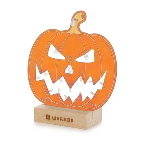 circuit imprimé XL orange en forme de citrouille avec détails dorés • 16 LED RVB adressables (programmables) – WS2812 •• 13 x LED RVB de 5 mm •• 3 x LED RVB de 8 mm • ATtiny85 • avec bouton • câble USB A – USB B (alimentation) • support en bois • mode d’emploi détaillé et vidéo disponibles en 5 langues • avec code d’exemple pour Arduino • kit éducatif & amusant pour tous les âges et niveaux • non inclus: fer à souder, étain à souder, pince, tapis de soudage