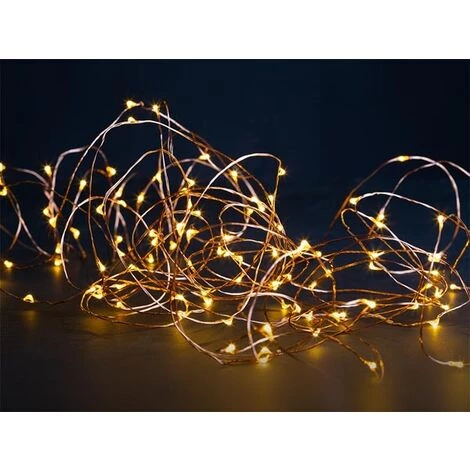 Caractéristiques physiques: •• Longueur (câble): 3 m •• Couleur du câble: Cuivre, Transparent •• Longueur de la guirlande lumineuse: 12 m •• Nombre de LED: 120 •• Nombre de LED par mètre: 10 •• Nombre de fils: 1 •• Diamètre (LED): 5 mm • Informations générales: •• Ligne de produits: Deco line •• Série de produits: Maia • Données techniques: •• Couleur (LED): Blanc chaud •• Masse volumique: High •• Effet lumineux: Continu •• Avec effet lumineux: Non •• Nombre de couleurs: 1 •• Technologie de clignotement aléatoire: Non •• Effet de clignotement: Non • Fonctions: •• Modulateur: Non • Données environnementales: •• Indice IP: IP20 •• Pour usage dans: Intérieur uniquement •• Résistant aux intempéries: Non • Connexions électriques: •• Type de fiche secteur: Fiche Euro •• Fils torsadés: Oui •• Nombre de connexions maximal en chaîne: 1 • Alimentation: •• Fréquence d’entrée nominale: 50/60 Hz •• Consommation: 3.6 W •• Tension de sortie nominale de l’adaptateur (VCC): 4.5 V DC •• Tension d’entrée nominale de l’adaptateur (VCA): 220-240 V AC • Informations de base sur le produit: •• Poids: 135 g
