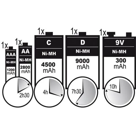 chargeur pour piles NiMH (nickel metal hydride) avec sortie USB 5VCC charge et décharge 4 canaux indépendants: recharge simultanée de 1~4 piles NiMH type R03/R6/R14/R20, ou 1 ou 2 piles NiMH 9V, quel que soit le type sélection automatique du courant de charge l’afficheur LCD indique le niveau de charge des piles protection contre la polarité inversée contrôle par microprocesseur interruption delta V négatif (R03/R6/R14/R20) minuterie contre les surcharges indication d’accu défectueux