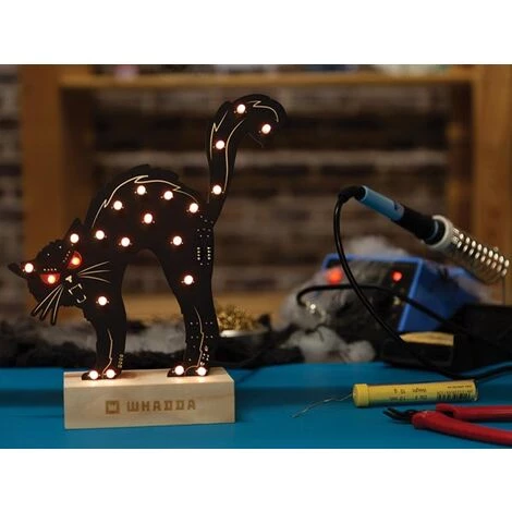 circuit imprimé XL noir mat en forme de chat avec détails dorés 22 LED RVB adressables (programmables) – WS2812 20 x LED RVB de 5 mm 2 x LED RVB de 8 mm ATtiny85 avec bouton câble USB A – USB B (alimentation) support en bois mode d’emploi détaillé et vidéo disponibles en 5 langues avec code d’exemple pour Arduino kit éducatif & amusant pour tous les âges et niveaux non inclus: fer à souder, étain à souder, pince, tapis de soudage