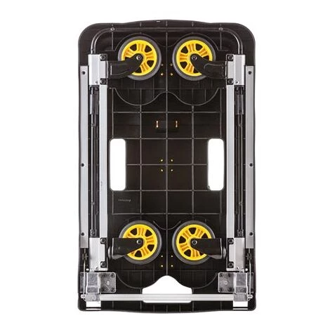 se plie et se déplie en quelques secondes. 4 roues pliables. Livré entièrement monté. facile à utiliser et à stocker design compact et léger, fabriqué en aluminium durable contient des pièces en nylon et des pièces en polypropylène cadre en aluminium et acier inoxydable poignée réglable, plateforme avec fentes permettant l’empilage de plusieurs paniers