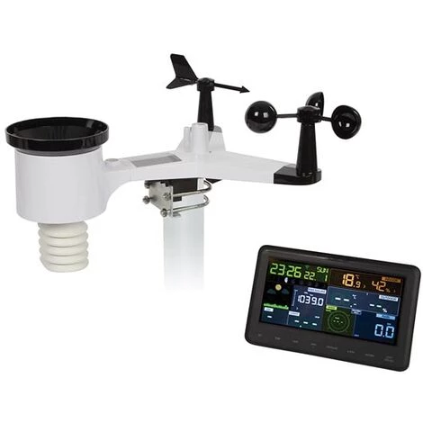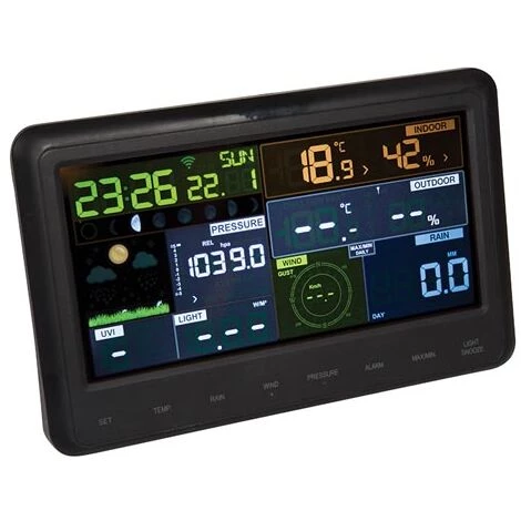 station météo wifi avec grand écran couleur et affichage de température intérieure/extérieure luminosité réglable mesures extérieures: température – humidité – pluviosité – direction du vent – vitesse éolienne – rayons ultraviolets (UV) – rayonnement solaire mesures intérieures: température – humitité – pression atmosphérique prévisions météo avec symboles: soleil – soleil & nuages – nuages – pluie- orage -neige affichage de la tendance météo alarmes: température – humidité – vent enregistrement des valeurs d’humidité et des températures min/max affichage de la température: °C – °F langue: anglais affichage de l’heure: date – jour de la semaine – heure (12/24 h) alarme avec fonction de répétition DCF: horloge radiopilotée avec mise à jour automatique de l’heure application: oui (iPhone® – Android®) logiciel d’ordinateur: non téléchargement de données vers server météo: Wunderground