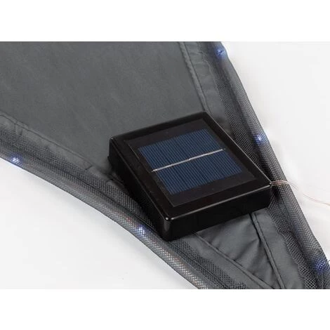 protégez-vous du soleil pendant la journée tout en apportant une ambiance chaleureuse à votre jardin ou votre terrasse dans la soirée 107 LED intégrées avec panneau solaire: ne nécessite pas de piles ni de câbles capteur crépusculaire: les LED s’allument automatiquement au crépuscule (il est possible de désactiver le capteur) 2 modes: allumage continu – clignoter toile déperlante et résistante grâce à des extrémités et contours renforcés toile de polyester haute densité (160 g/m²) anneaux en acier inoxydable